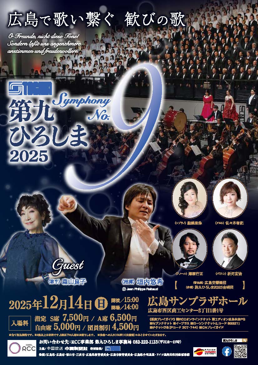 | 出演 | 指揮:垣内悠希 管弦楽:広島交響楽団 ソリスト:船越亜弥(ソプラノ)、佐々木有紀(アルト)、澤原行正(テノール)、折河宏治(バリトン) ゲスト:森山良子 合唱:第九ひろしま2025合唱団 |