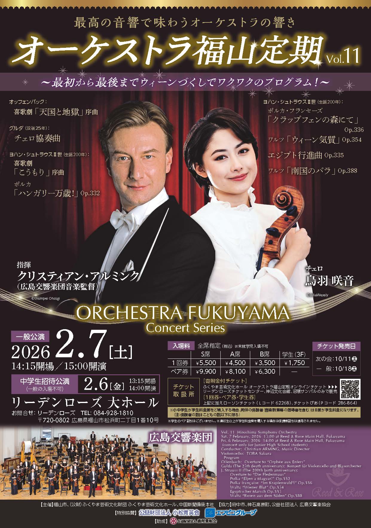 | 取り扱い | RCCオンラインチケット、ローソンチケット(Lコード:63321)、チケットぴあ(Pコード:307-744)、イープラス、セブンチケット、CNプレイガイド、エディオン広島本店PG ※広響事務局での取り扱いはございません |