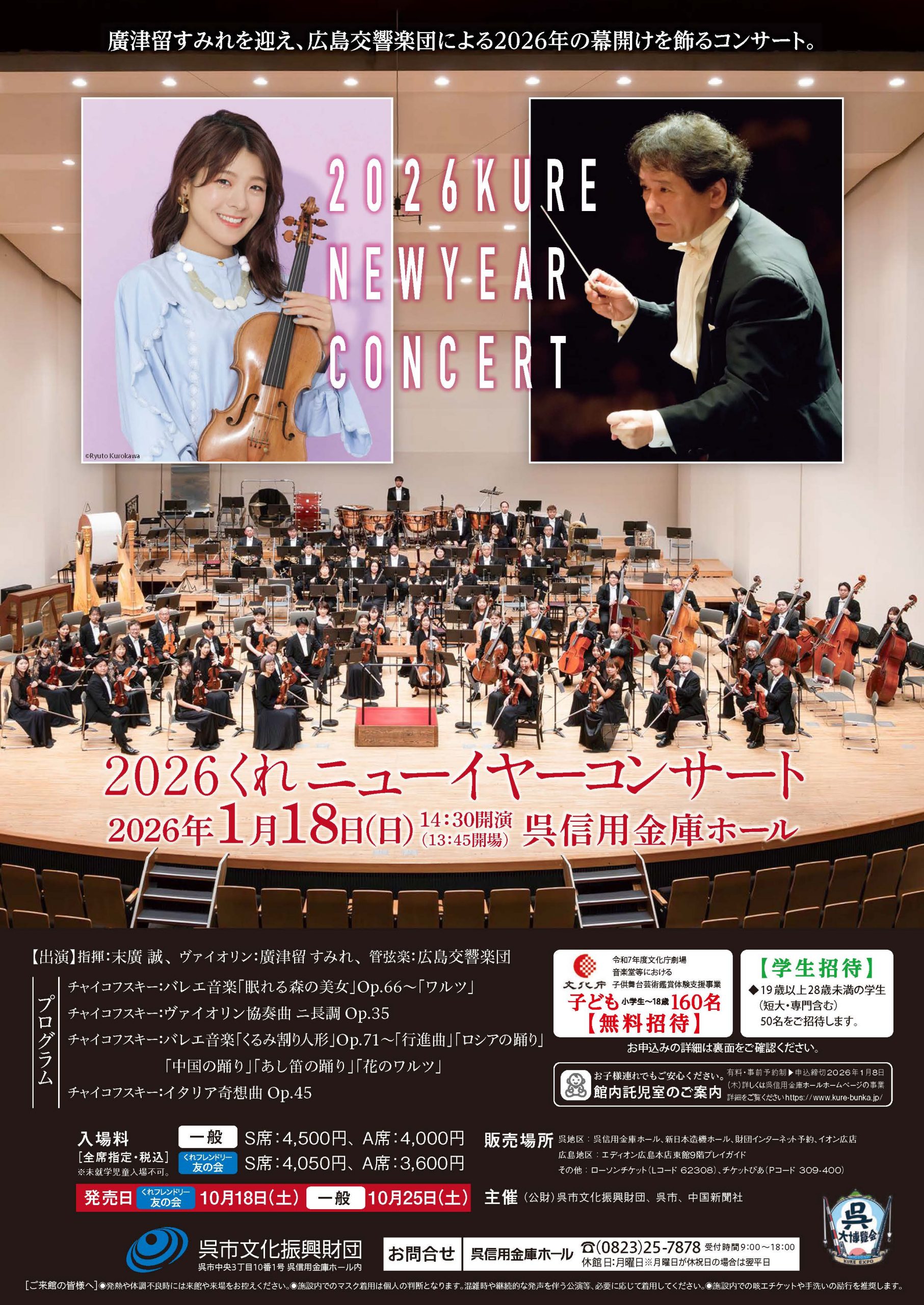 | 備考 | ※託児室あり(事前予約制) ※子ども招待(6~18歳)、学生招待(19~28歳)がございます。詳しくは呉信用金庫ホールのサイトをご覧ください。 |