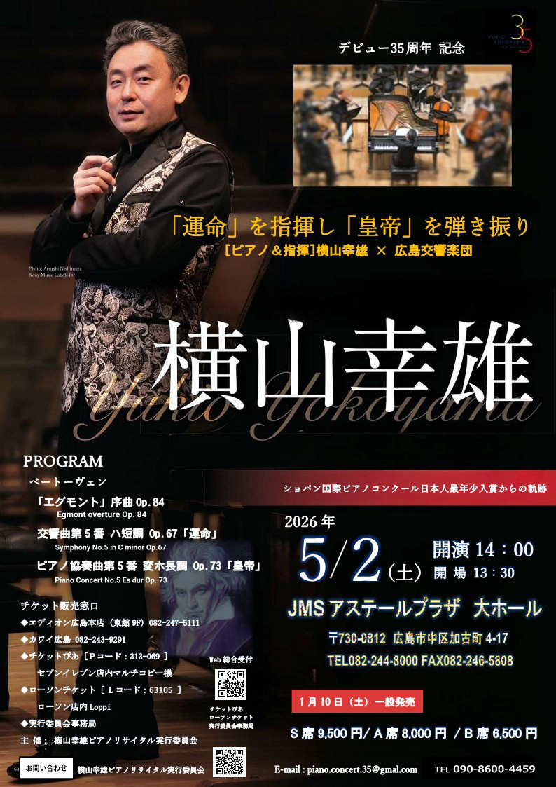 | 取り扱い | ・エディオン広島本店(東館9F):082-247-5111 ・カワイ広島 :082-243-9291 ・チケットぴあ【Pコード:313-069】 ・ローソンチケット【Lコード:63105】 ・横山幸雄ピアノリサイタル実行委員会事務局