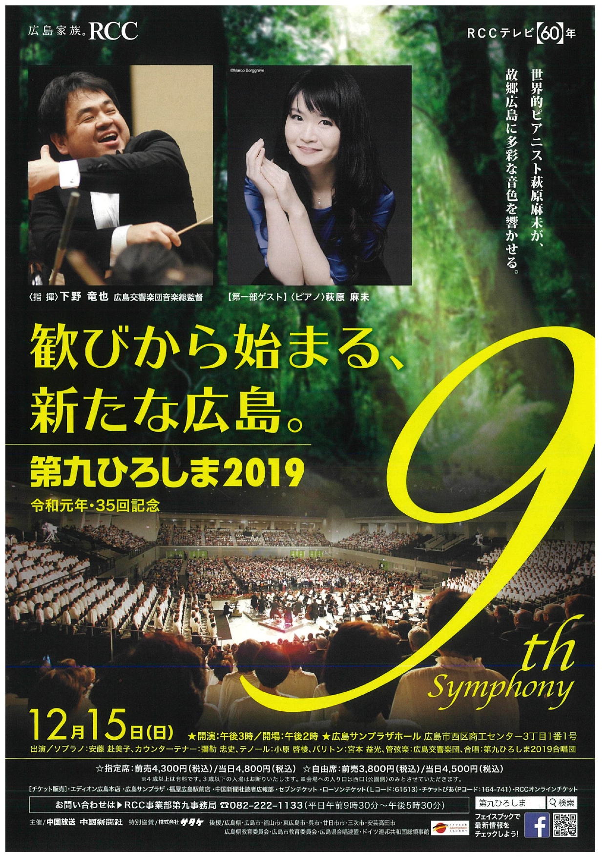 | 出演 | 指揮:下野竜也 [第一部] ゲスト:萩原麻未(ピアノ) 指揮:下野 竜也 管弦楽:広島交響楽団 [第二部] 独 唱:ソプラノ/安藤赴美子、カウンターテナー/彌勒忠史、テノール/小原啓楼、バリトン/宮本益光 管弦楽:広島交響楽団 合 唱:第九ひろしま2019合唱団 |