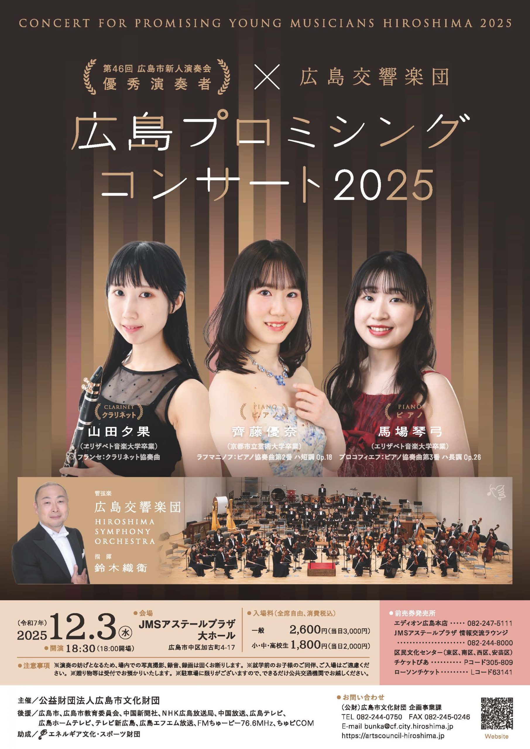 | 出演 | 指揮:鈴木織衛 クラリネット:山田夕果 ピアノ:齊藤優奈 ピアノ:馬場琴弓 管弦楽:広島交響楽団 |