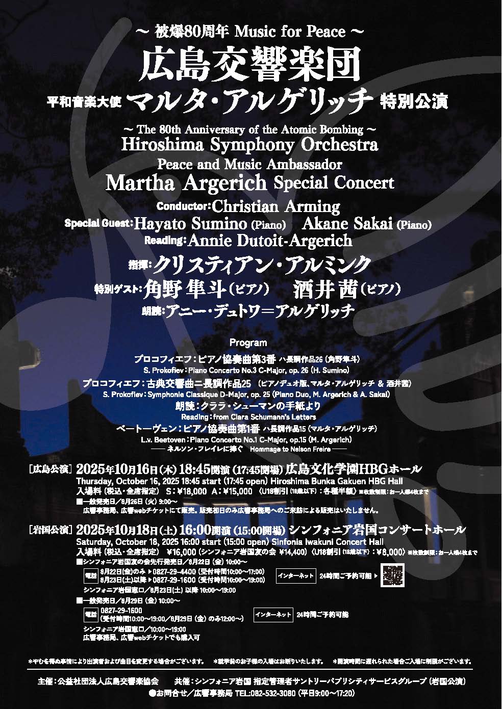 | Program | S. Prokofiev : Piano Concerto No.3 C-Major, op.26 (H. Sumino) S. Prokofiev : Symphonie Classique D-Major, op.25 (M. Argerich & A. Sakai) Reading : From Clara Schumann’s Letters L.V. Beethoven : Piano Concerto No.1 C- Major, op.15 (M. Argerich) |