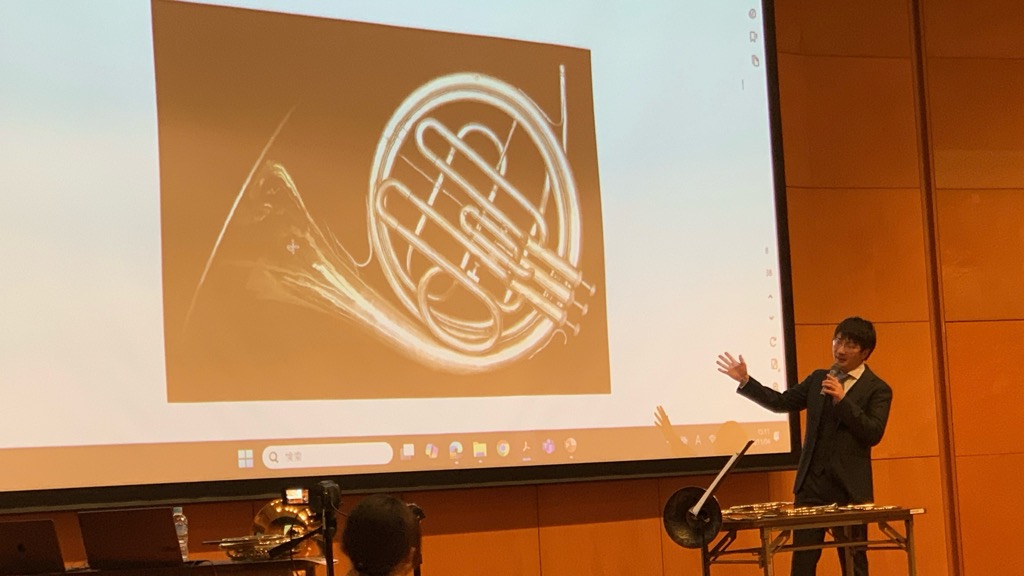 首席ホルン奏者の小田原瑞輝による「ホルンで紐解くオーケストラの世界」と題した講義では、楽器の仕組み、ホルンの歴史・オーケストラの中でのホルンの役割の変化などを説明しました。